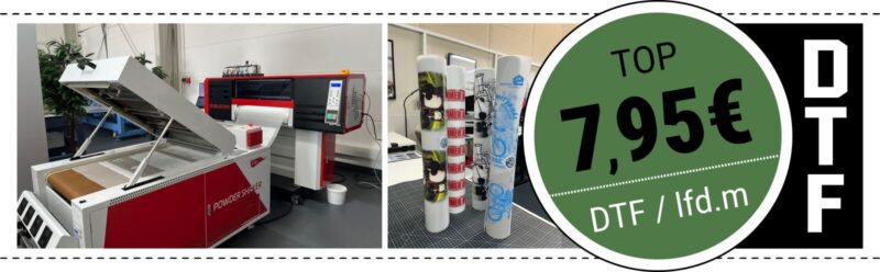 DTF Produktion zum absoluten Top Preis. Druckbreite: 56cm – supersofte Transfers – Hotpeel geeignet für nahezu alle Untergründe. Die Produktion erfolgt auf hochmodernen DTF Druckern mit Output mehrerer hundert Metern DTF am Tag. Bestellen Sie einfach per Online Shop / Formular oder E-Mail … » mehr Infos
